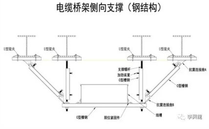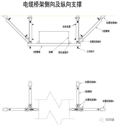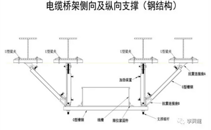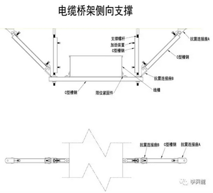 2、桥架两端设置侧向抗震支撑,抗震支撑间距超过最大设计间距时,应在中间增设抗震支撑。